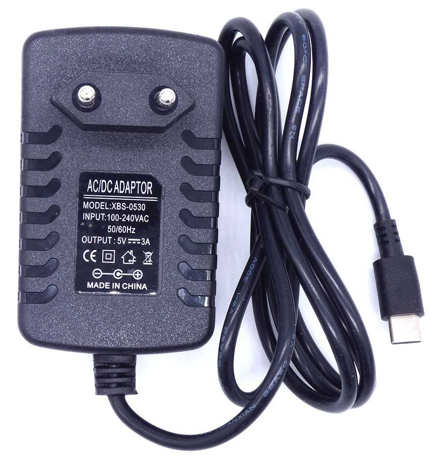 transformateur / alimentation avec d’un coté une prise 220 Volts (EU) et de l’autre avec une prise mâle de type USB-C de 5 Volt (3 Ampères).