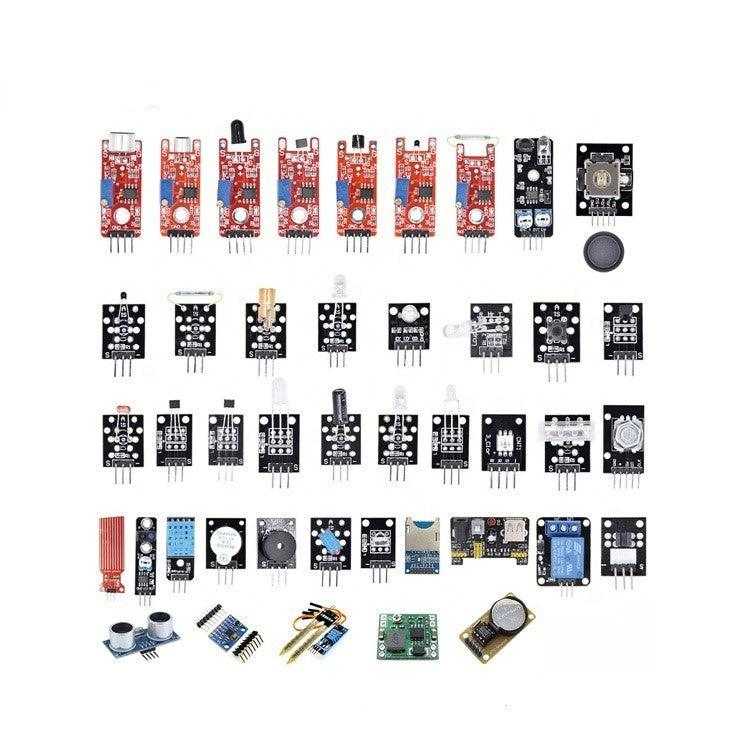 module d’horloge 1 SMD 3 RGB 1 Module capteur de flamme 1 Petit son 1 Module LED 2 couleurs 1 Avertisseur sonore 1 Module bouton 1 Module gyroscope MPU6050 1 Capteur magnétique Holzer analogique 1 Interrupteur d’inclinaison 1 Module de capteur d’émission infrarouge 1 Module de suivi 1 Module de contrôleur de jeu PS2 Joystick 1 Buzzer passif 1 Capteurs Hall magnétiques linéaires 1 Récepteur IR 1 petit module LED 2 couleurs 1