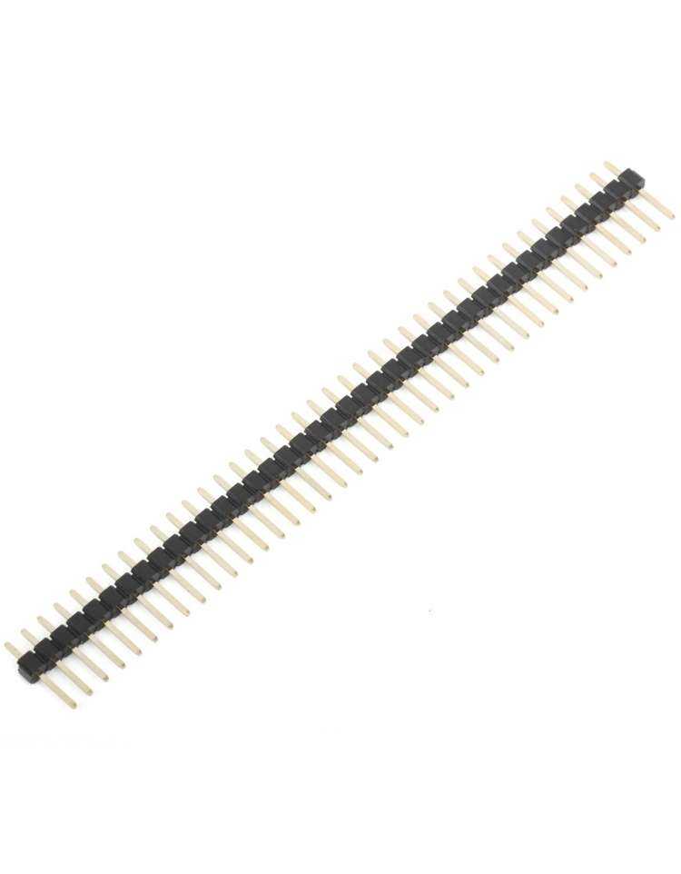 Ce connecteur est une bande d’en-tête mâle droite à une rangée, à 40 broches, qui peut être coupée ou divisée en bandes plus petites. Cette bande a une base en plastique de couleur standard ( noire ); d’autres couleurs sont disponibles pour ceux qui cherchent à ajouter du caractère (ou des connexions codées par couleur) à leurs projets.
