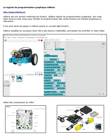 - Logiciel et programmation : mBlock (graphique) Mac, Windows, iPad mBlocky, Arduino IDE